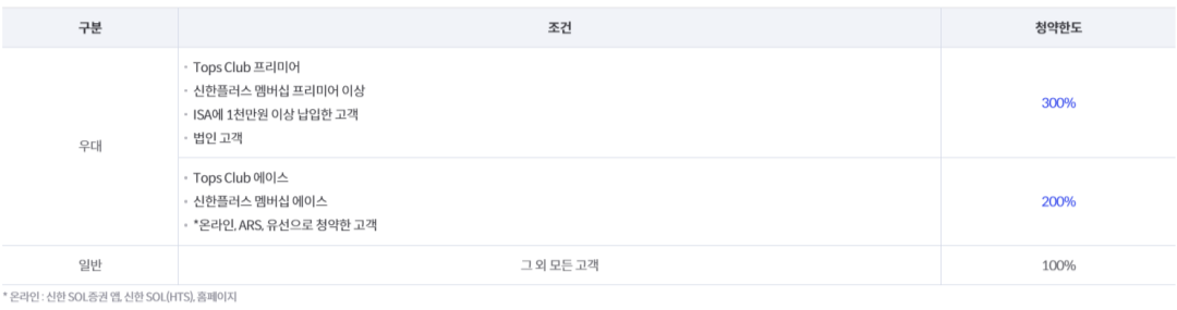 1인당 청약할 수 있는 공모주 수는 정해져 있습니다. 단, 우대 조건을 갖춘 고객은 더 많이 청약할 수 있습니다. 우대조건에 해당하는 지 확인해보시고 해당 한다면 더 많은 공모주를 받아서 혜택을 받아보실 수 있습니다.