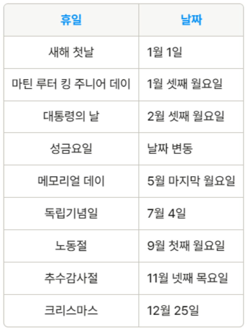 미국주식을 사려고 마음먹었다면, 휴장일을 미리 체크해서 주가변동을 고려하여 구매계획을 수립해야 합니다. 미국주식 시장은 미국의 주요 공휴일에 따라 휴장하고 있습니다. 주요 휴장일은 아래와 같이 체크하시면 됩니다.