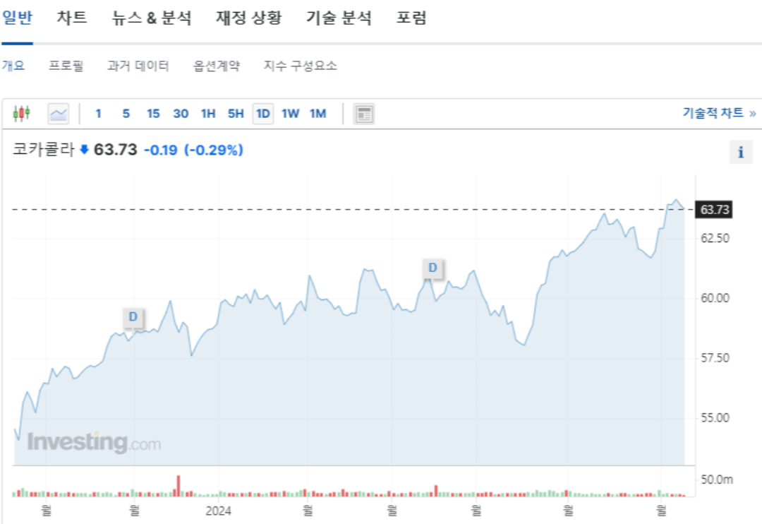코카콜라는 음료 시장에서 독보적인 위치를 차지하고 있으며, 전 세계적으로 높은 브랜드 인지도를 자랑합니다. 다양한 음료 제품군을 통해 안정적인 수익을 창출하고 있으며, 지속적인 배당 지급으로 유명합니다.
