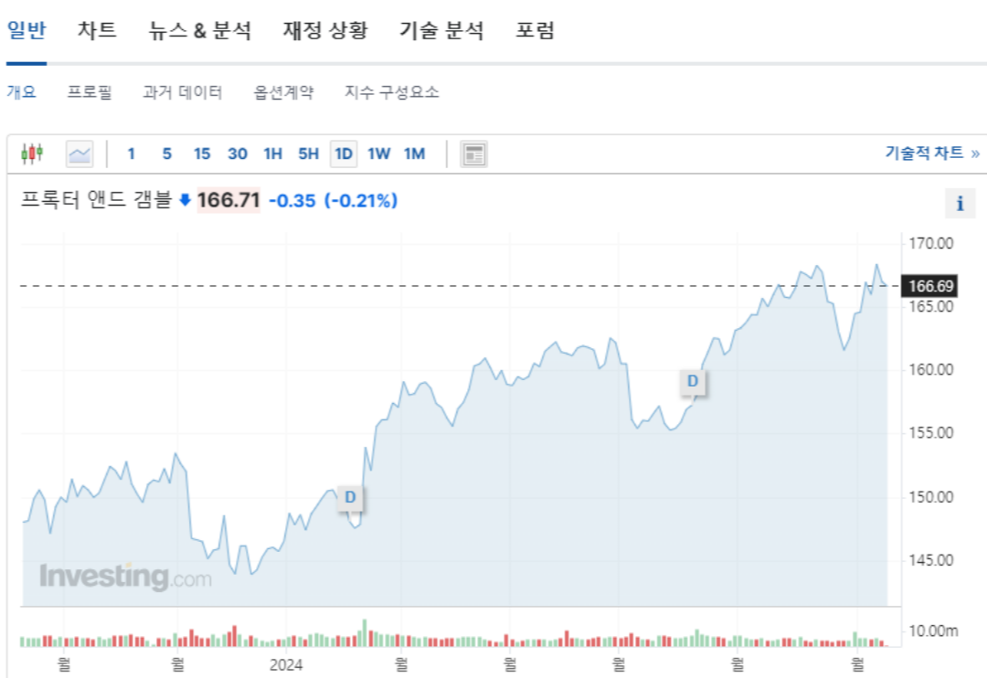 P&G는 생활용품 분야에서 글로벌 리더로, 다양한 브랜드 포트폴리오를 보유하고 있습니다. 지속 가능한 성장과 안정적인 배당을 제공하는 기업으로, 장기 투자자들에게 적합합니다.