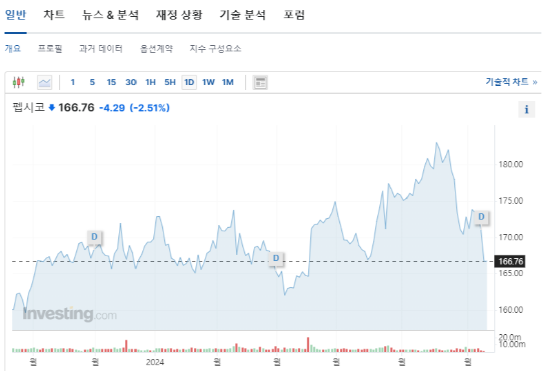 펩시코는 음료와 스낵 제품을 포함한 다양한 소비재 포트폴리오를 보유하고 있습니다. 코카콜라와 함께 글로벌 음료 시장을 주도하고 있으며, 지속 가능한 성장과 안정적인 배당을 제공합니다.