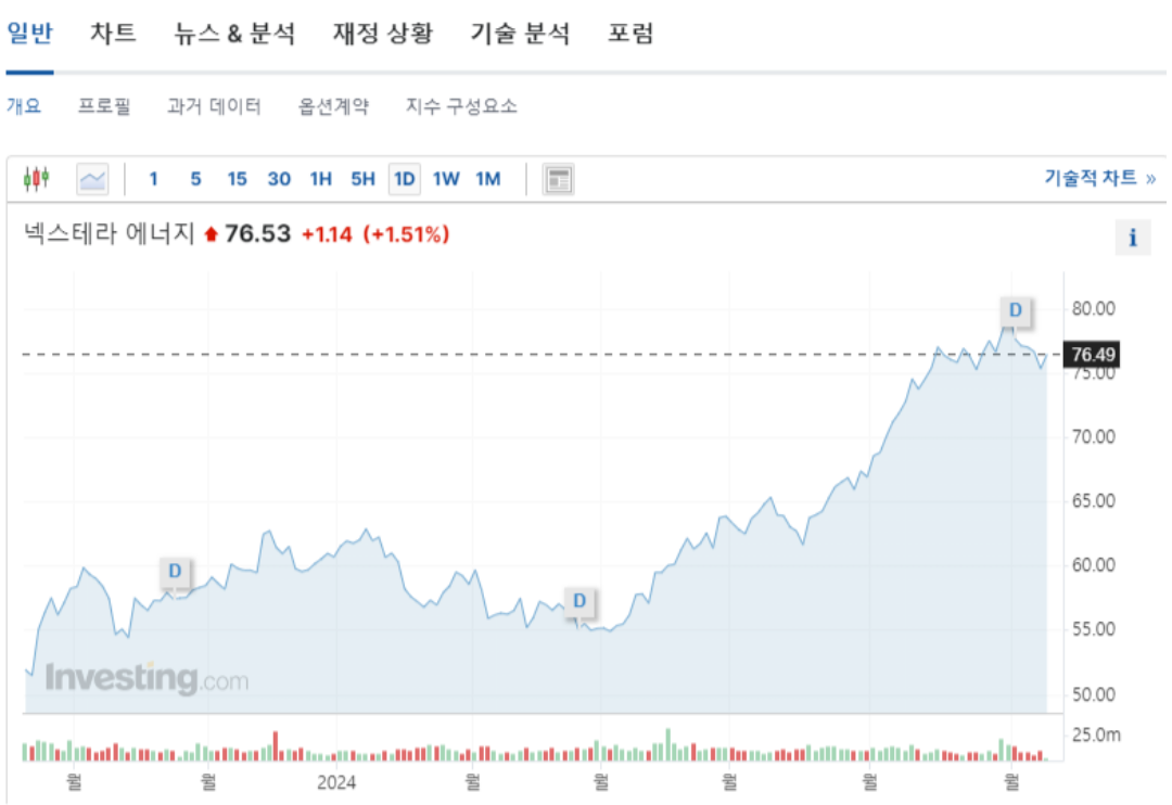 넥스트에라 에너지는 미국에서 가장 큰 재생에너지 기업 중 하나로, 특히 풍력과 태양광 에너지에 집중하고 있습니다. 지속 가능한 에너지 솔루션을 제공하며, 미국 내에서 재생에너지 프로젝트를 활발히 전개하고 있습니다. 넥스트에라 에너지는 지속적인 수익 성장과 함께 안정적인 배당을 제공하고 있어, 장기 투자자들에게 매력적인 선택입니다.