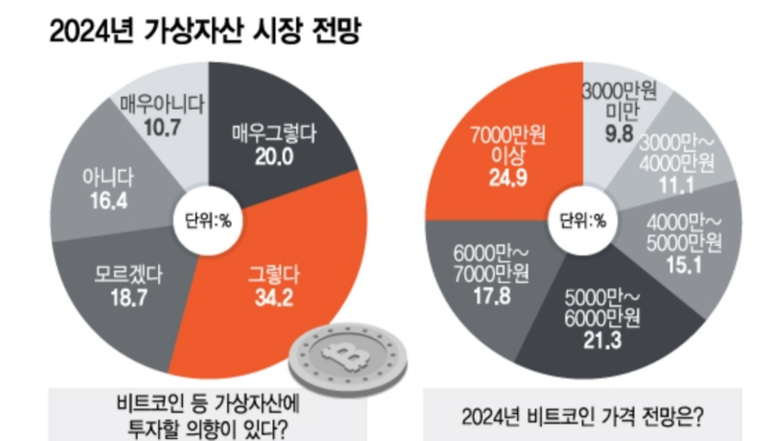한국에서도 암호화폐에 대한 관심이 높아지고 있습니다. 한국경제신문이 주요 금융사 CEO들을 대상으로 한 조사에 따르면, 절반에 가까운 CEO들이 암호화폐 투자에 관심을 보였습니다. 이들 중 일부는 전체 포트폴리오의 1~5%를 비트코인에 투자할 의향이 있다고 밝혔습니다. 이는 비트코인이 점차 투자 자산으로 자리잡아가고 있음을 보여줍니다.