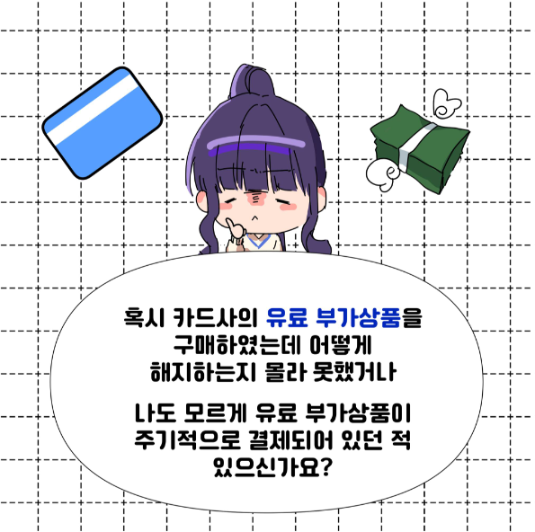 현재 카드사들이 운영하는 유료 부가상품은 신용정보 서비스, 채무면제 서비스, 생활 혜택형 서비스, 정기배송 서비스 등 1000여 개가 넘는 종류가 있다고 해요. 우리나라 인구 5명 중 1명이 이러한 유료 부가상품에 가입하고 있을 정도로 규모가 큰 편이죠. 본인이 원하는 서비스를 이용하는 경우에는 문제가 없지만, 자신도 모르게 가입했거나 유료인지 인지하지 못하고 가입한 경우에는 불필요한 서비스로 인해 금전적인 부담을 느끼게 될 수 있어요.