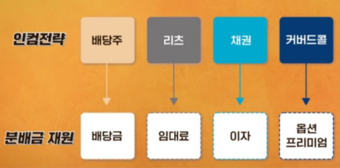 매달 나오는 현금 흐름(배당금)으로 변동성이 심한 시기를 넘길 수 있다는 장점도 있습니다. 변동성이 높은 시기에는 커버드콜로 높은 분배금을 받으며 채권 투자 등을 지속하다가, 채권 금리의 방향성이 정해지면 기초자산만 담은 상품으로 갈아타는 것도 좋은 전략입니다.