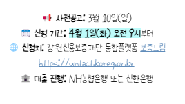 총 대출 규모는 100억원으로, 지원 대상은 만 18세에서 45세 사이의 예비 창업자 또는 업력 7년 미만의 사업장을 운영하는 청년 사업자입니다. 대출 한도는 최대 5천만원까지이며, 강원신용보증재단의 협약보증을 통해 대출이 지원되고, 5년간 대출 이자를 전액 지원받을 수 있다는 점이 큰 장점입니다.