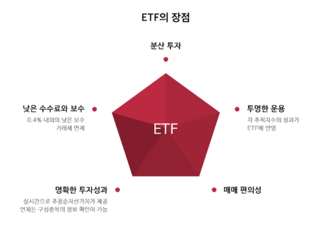 ETF의 장점으로는 개별 종목 투자로 인한 변동성이 적기 때문에 중장기 투자자에게 꾸준한 수익률을 가져다 줄 수 있다는 점입니다. 수수료 또한 0.03%~0.09% 정도로 낮은 편에 속하기 때문에 별도 비용이 발생하는 부담도 크지 않습니다.