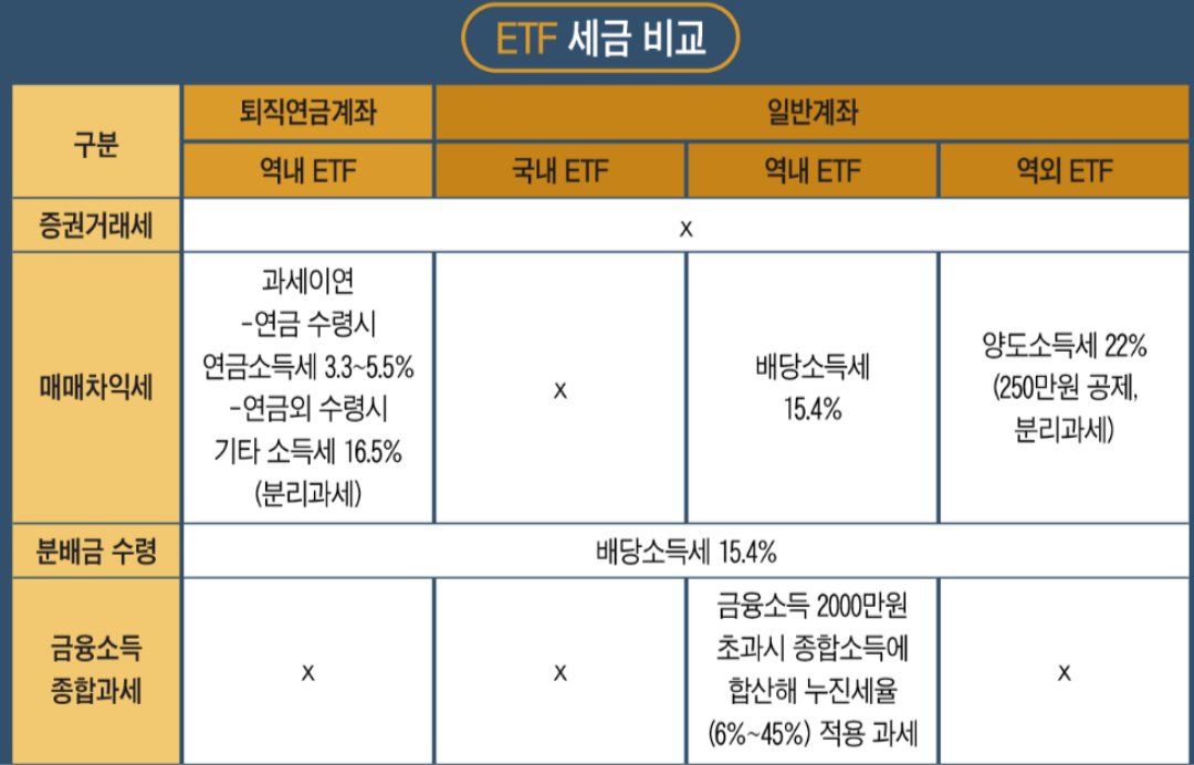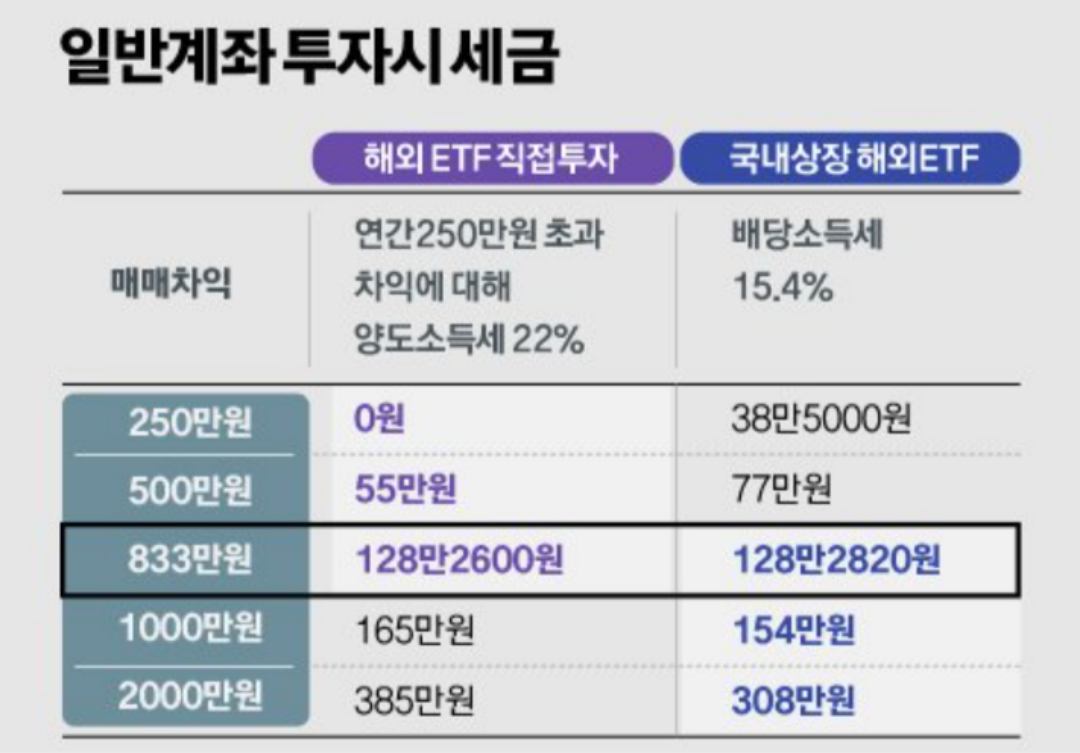 다만 투자 및 중도인출 등의 제한이 없어 가장 자유로운 계좌이나, 세제혜택 또한 없다는 단점이 있습니다. 참고로 국내상장 ETF의 매매차익은 배당소득세로, 해외상장 ETF의 매매차익은 양도소득세로 과세됩니다 배당소득세의 경우 15.4% 원천 징수되며, 이자와 배당을 합친 연간 금융소득이 2천만원이 넘어갈 경우 종합과세 대상입니다. 양도소득세의 경우 연간 250만원까지는 비과세이나, 초과되는 부분에 한해서는 22%의 세금을 내야합니다.