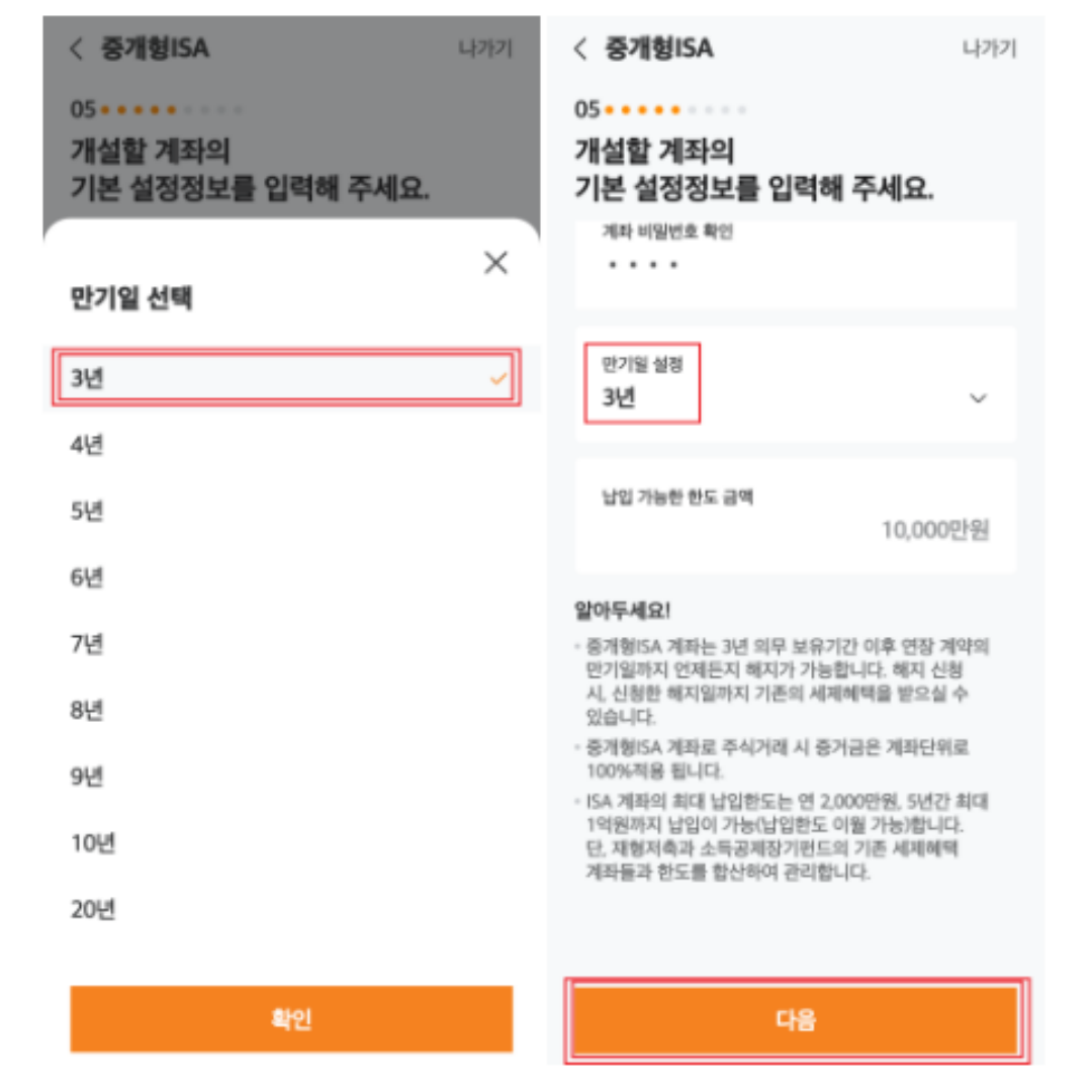 ISA 계좌 등록에 필요한 개인정보 등록이 완료되었다면, 개설할 계좌의 기본 설정정보를 입력해주면 됩니다. 비과세 요건이 3년이기 때문에 통상적으로 만기일은 3년으로 설정하고, 납입 가능한 한도 금액은 상황에 맞게 설정해두시면 됩니다.