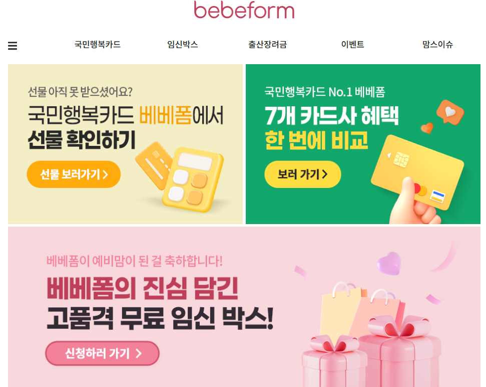 국민행복카드를 발급받기 위해서는 결제 금액을 인출할 통장이 필요하지만, 통장에 잔고가 없더라도 바우처 지원금은 문제없이 사용할 수 있다는 점이 좋아요. 평소에 자주 사용하는 다른 카드가 있다면 해당 카드로도 결제가 가능하답니다. 신청은 ‘베베폼’이나 ‘미즈톡톡’과 같은 플랫폼을 통해 간편하게 할 수 있어요. 임신 확인서를 수령한 후 카드 신청을 하고, 발급이 완료되면 바우처 지원금을 신청하는 순서로 진행되니 참고해주세요. 베베폼을 통해 응모하고 10만원 이상 결제하면 사은품을 받을 수 있는 혜택도 있으니, 신한카드나 삼성카드 발급을 고려하고 있다면 꼭 확인해보세요.