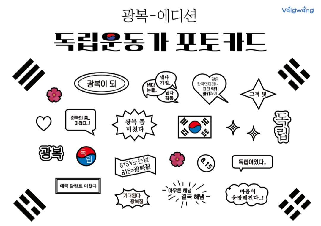 광복절을 기념하여, 독립과 관련된 영어 단어와 우리의 역사를 빛낸 독립운동가 12분을 배울 수 있는 포토카드 도안을 무료로 나눔합니다. 이 포토카드를 통해 아이와 함께 독립운동가들의 이야기를 나눌 수 있습니다. 해당 영상을 참고하시면 되고, 8월 16일(금)까지 무료나눔으로 진행되며, 이후 유료 판매로 전환됩니다.