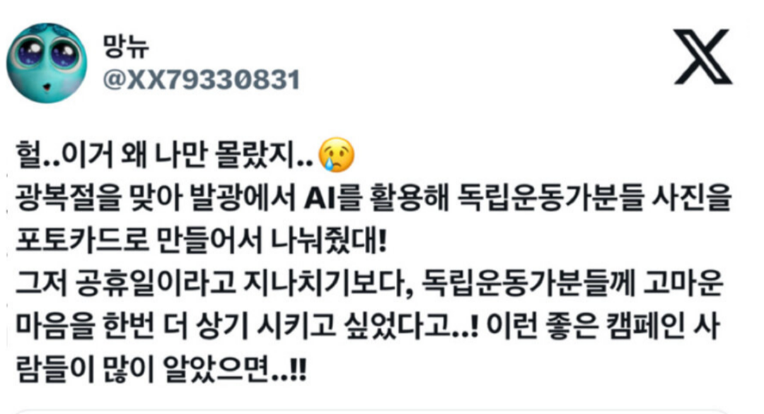 이번 포카는 독립운동가들의 삶과 업적을 기억하고 기념하기 위한 특별한 프로젝트입니다. 광복절을 맞아 기획된 이 행사에서는 AI 기술을 활용하여 독립운동가 분들의 존엄한 모습을 담은 포토카드를 제작하였습니다. 아이돌의 전유물로 여겨졌던 포카가 이제는 역사적 인물들을 기념하는 매개체로 자리 잡게 된 점이 흥미롭습니다. 포카를 통해 독립운동가의 희생 정신을 되새기고, 그들의 이야기를 더 많은 사람들과 나누는 기회를 제공하고자 합니다.