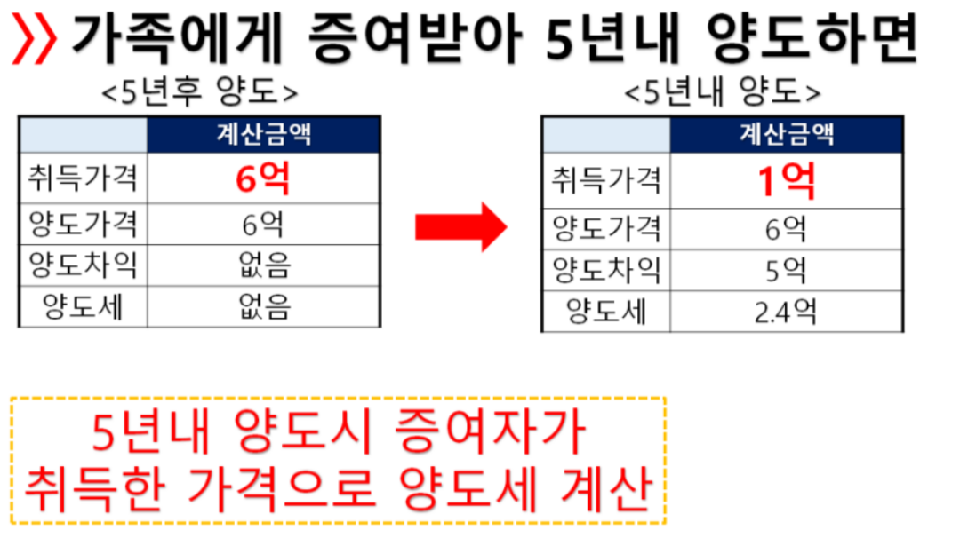 부동산을 증여할 경우, 증여세의 배우자 공제 제도를 활용하면 향후 그 부동산을 처분할 때 발생하는 양도소득세를 줄일 수 있습니다. 예를 들어, 1억원에 취득한 부동산을 5년 후 6억원에 매각하는 경우 5억원의 양도 차익에 대한 양도세를 납부해야 합니다. 하지만 현재 4억원인 부동산을 배우자에게 증여하고 5년 뒤 6억원에 매각한다면 양도 차익이 2억원으로 줄어들어 그에 대한 양도세만 내면 됩니다. 단, 증여받은 부동산은 5년이 지나서 팔아야 합니다. 증여받은 때로부터 5년 이내에 매각할 경우, 증여자의 취득 가액을 기준으로 양도 차익을 계산하기 때문에 절세 효과를 누리기 어렵습니다.