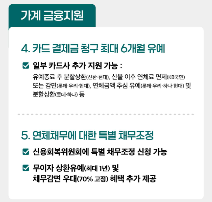 카드 결제대금 유예와 분할 상환도 적용되어, 당장 눈앞의 연체 부담을 줄이고