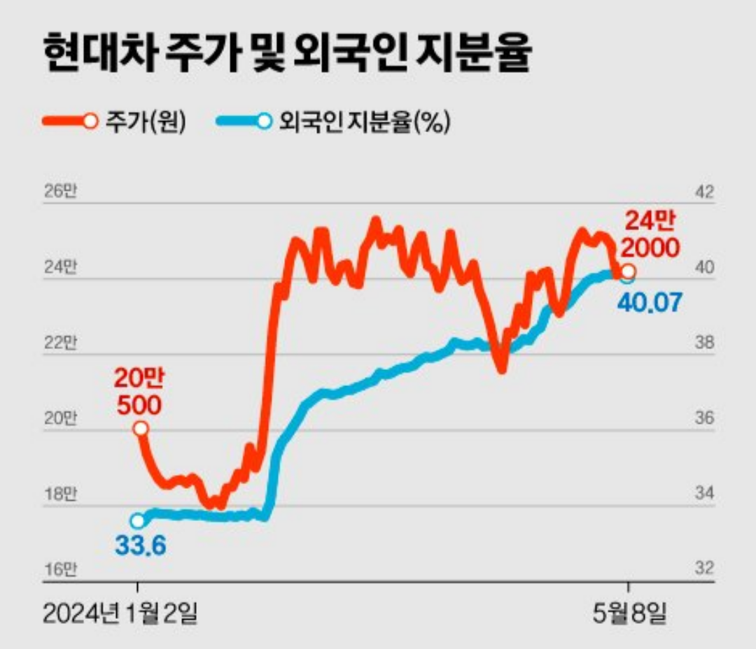 국내 증시는 외국인의 매수·매도세에 따라 주가가 출렁이는 경우가 많습니다. 외국인 지분 비중이 늘어나는 종목에 투자하는 것이 포인트입니다. 현대차의 경우 연초 외국인 지분율이 33.6%였는데, 현재 40% 이상으로 높아졌습니다. 외국인 매수세가 특히 강할 때 주가도 급등했으며, 주가 조정 시기에도 외국인 매수세가 유지되면서 주가 반등을 이끌었습니다.